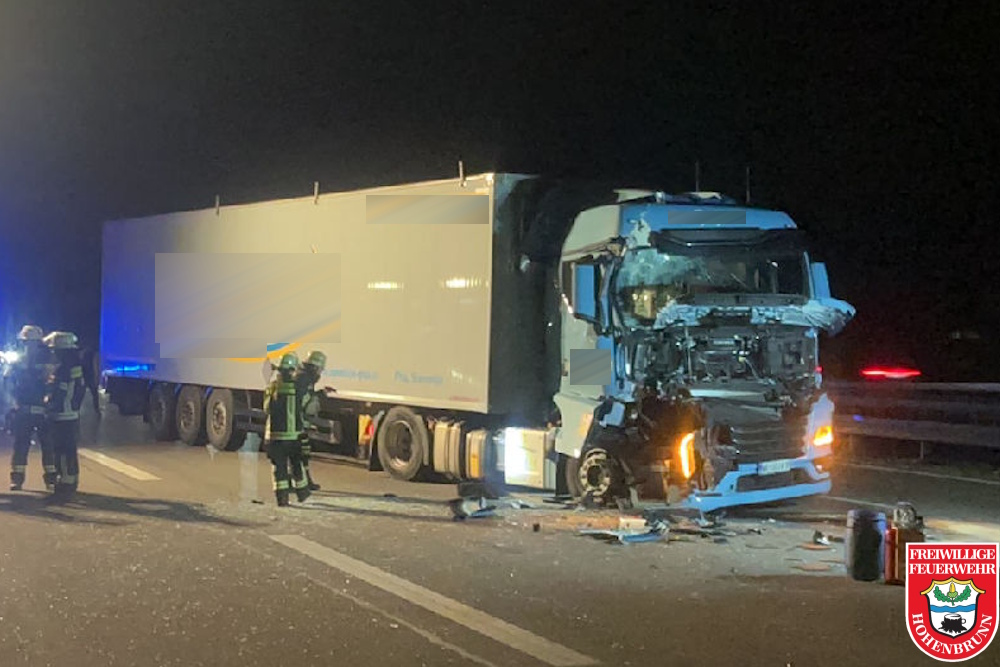 Die Feuerwehr Hohenbrunn übernahm die Absicherung und Ausleuchtung der Einsatzstelle, stellte den Brandschutz sicher und band ausgelaufene Betriebsmittel. Die Ladung des beschädigten LKW bestand aus Aluminiumspänen und stellte keine zusätzliche Gefahr dar. Zum Zeitpunkt des Abrückens der Feuerwehr hatten die Bergungsarbeiten noch nicht begonnen.
