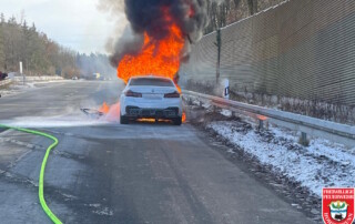 Am 06.01.2026 wurde die Feuerwehr Hohenbrunn zu einem Fahrzeugbrand auf der Staatsstraße 2078 alarmiert. Ein BMW M5 stand beim Eintreffen der Einsatzkräfte bereits in Vollbrand, bereits auf der Anfahrt war von Weitem eine Rauchwolke erkennbar.